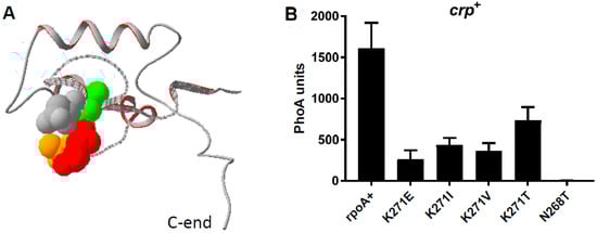 (A) The structure of the RpoA C-terminal domain as determined by NMR (PDB 1C00) []. The image was generated with Swiss-PdbViewer v4.1.0. The domain is represented as a ribbon, and the side chains of relevant residues are shown in space filling (residues 268–272). N268 is shown in grey, L270 in green, K271 in red and A272 in orange. (B) crp+ strains with the indicated rpoA alleles contain the psM74c plasmid expressing wild-type AraC and a Maspin::PhoA chimera. Cultures were induced for 1 h with arabinose.