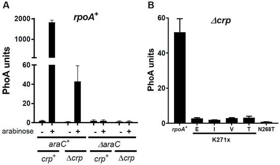 Both AraC and Crp promote transcription from the PBAD promoter in the presence of arabinose [,]. While AraC is absolutely required, a 20- to 40-fold reduction in expression can be detected in an rpoA+ strain in the absence of Crp (Figure 3A). Quantification of phoA expression from the PBAD promoter in strains deleted for crp and carrying five alleles of rpoA demonstrated a strong reduction of promoter activity with the four substitutions of K271, while the N268T mutation totally abolishes expression (Figure 3B). These findings imply that the α-CTD is required for PBAD transcription in the absence of Crp.