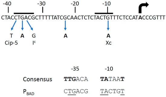 We isolated four plasmids that contain mutations in the PBAD promoter (Figure 4). One of these, at position −36, was located in the −35 hexamer, between the cip-5 site [,] and the Ic mutations [,]. The cip-5 and Ic promoters allow AraC-independent constitutive expression, and the −36 mutation could also facilitate RNA polymerase binding. The second one, at position −23, has a weaker stimulatory effect. The last two, located at position −10, are identical to the Xc mutation, which has been described as creating a strong AraC-independent promoter [,]; a PBAD promoter carrying the Xc mutation is not affected by the rpoA341 K271E mutation []. No mutation was isolated in the regulatory region between the araC coding sequence and the PBAD promoter (Figure 1).