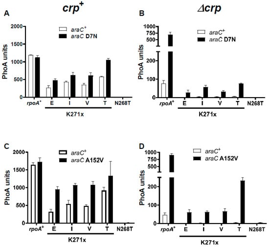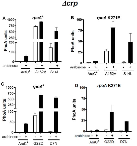 These araC mutants were isolated in strains carrying either the K271E or K271V RpoA substitutions. We determined the capacity of the araC mutations to suppress the four different K271X substitutions, as well as the N268T one. The results shown in Figure 6 were obtained with AraC D7N and A152V; similar results were obtained with S14L and G22D (Supplementary Figure S1). In induced rpoA+ crp+ strains, expression from the PBAD promoter was slightly increased (1.5- to 3-fold) by the araC mutations (Figure 6A,C). In almost all cases, the expression observed with the rpoA mutants did not reach the levels observed in rpoA+ strains, indicating that the AraC suppressors do not fully compensate for the rpoA defect. However, the AraC D7N substitution restored the AraS phenotype conferred by PAI2::PhoA in an rpoA K271T crp+ strain; an effect of the other araC mutations could not be tested because of their constitutive activity. In Δcrp strains, stimulation by the araC mutations was much higher (Figure 6B,D). In rpoA+ Δcrp strains, the suppressors nearly compensated for the absence of Crp, as shown above in Figure 5. With the four rpoA K271 substitutions, the araC mutations increased expression 8- to 30-fold when compared to araC+. In no case was expression as high as that detected in rpoA+ strains, confirming that the araC mutations only partially compensate for the rpoA defects. Finally, the RpoA N268T substitution, which exerts the most drastic effect on PBAD expression, was not suppressed by any of these araC mutations, both in the presence and absence of Crp, suggesting two independent mechanisms for α-CTD activation.