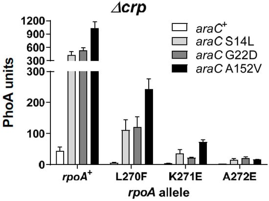 The following supporting information can be downloaded at: https://www.mdpi.com/article/10.3390/microorganisms12091928/s1, Figure S1: PBAD activity mediated by wild type AraC+ and S14L (A,B) or G22D (C,D). Plasmids expressing AraC+ or the indicated AraC suppressor proteins were introduced in crp+ (A,C) or Δcrp (B,D) strains with the indicated rpoA alleles. Cultures were assayed after a 1h induction with arabinose; Figure S2: Effects of the AraC suppressors on the two residues that flank K271 of the RpoA α-CTD. Plasmids expressing AraC+ or the indicated AraC suppressor proteins were introduced in crp+ strains carrying the rpoA+ or the three indicated rpoA alleles. Cultures were assayed after a 1h induction with arabinose; Figure S3: PBAD activity mediated by araC suppressors of RpoA A272E. Plasmids expressing AraC+ or the indicated AraC suppressor proteins were introduced in Δcrp strains expressing either the RpoA K271E or the K271V proteins. Cultures were assayed after a 1h induction with arabinose; Figure S4: High expression of the rpoA α-CTD deletion strongly decreased expression from the araBAD promoter. RpoA and the RpoA α-CTD deletion were expressed from the bacteriophage T4 32 promoter of pRDB8 []. Black bars: pRDB8-rpoA+; white bars: pRDB8-rpoAdelCTD. PhoA expression was measured in a rpoA+ Δcrp strain. With AraC+, the expression of PhoA was barely detectable with both plasmids. The expression of lacZ was measured in the HfrH strain.