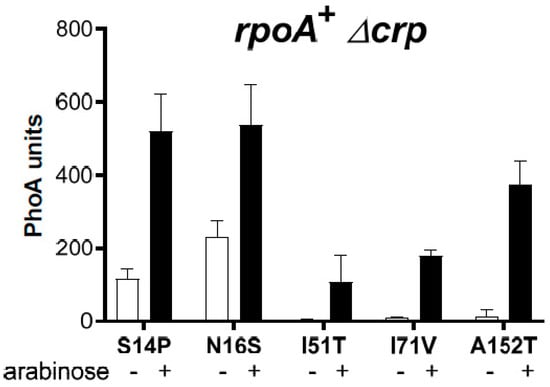 In a different approach, using a mutagenic PCR protocol on a plasmid harboring the wild-type araC gene, we identified three additional AraC residues (N16S, I51T, and I71V) whose substitutions resulted in increased PBAD expression in an rpoA A272E Δcrp strain. In addition, different substitutions were found at two previously identified residues (S14P and A152T). In the rpoA+ Δcrp strain, all compensated to a varying extent for the absence of Crp (Figure 8). The effect was maximal for the S14P mutant and minimal for the I51T mutant; the A152T mutant was less efficient than the A152V one (see Figure 6D). Furthermore, while the S14P and N16S mutants were partially constitutive, the other three mutants remained fully inducible; the A152T mutant, therefore, behaves clearly differently from the A152V mutant (Figure 8). These results confirm that a constitutive phenotype is not required for the suppression of the rpoA defects. The AraC I71V substitution restored the AraS phenotype conferred by PAI2::PhoA in the rpoA K271T crp+ strain, confirming that increased expression from the PBAD promoter can also be observed with this mutant in the presence of Crp. In Δcrp mutant strains carrying different rpoA alleles, increased expression was also detected (Supplementary Figure S3). Here again, we did not observe any allele specificity.
