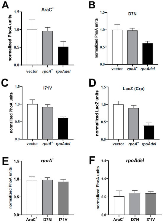 In rpoA+ Δcrp strains, the activity of AraC+ decreased about 2-fold in the presence of the RpoA deletion (Figure 9A). A similar decrease was observed with the two AraC suppressors, namely the D7N mutant located in the AraC N-terminal arm and the I71V mutant located in the core of the AraC-NTD (Figure 9B,C). This result is more evident when the activity of the three AraC proteins in cells carrying the RpoA+ (Figure 9E) or the RpoA deletion plasmid (Figure 9F) are directly compared. As a control, expression from the lacZ promoter, which is activated only by an interaction of the RpoA α-CTD with Crp [], was decreased to the same extent in the presence of the RpoA deletion (Figure 9D). When RpoA and the RpoA deletion were expressed from the strong bacteriophage T4 gene 32 promoter [], we observed an almost complete inhibition of PBAD expression (Supplementary Figure S4). Taken together, these results demonstrate that the RpoA α-CTD is required for transcriptional activation at the PBAD promoter with both wild-type and mutant AraC in the absence of Crp, suggesting that the AraC mutants functionally compensate for defects in the RpoA α-CTD by increasing AraC activation of RNA polymerase.
