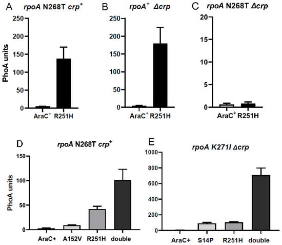 PBAD activity mediated by AraC R251H and AraC double mutants. Plasmids expressing AraC+ or the AraC R251H mutant were introduced into the rpoA N268T crp+ (A), rpoA+ Δcrp (B), or rpoA N268T Δcrp (C) strains. Plasmids expressing AraC+, AraC A152V, AraC R251H, or the double mutant A152V-R251H were introduced into the rpoA N268T crp+ strain (D). Plasmids expressing AraC+, AraC S14P, AraC R251H or the double mutant S14P-R251H were introduced into the rpoA K271I Δcrp strain (E). Cultures were assayed after a 1 h induction with arabinose.
