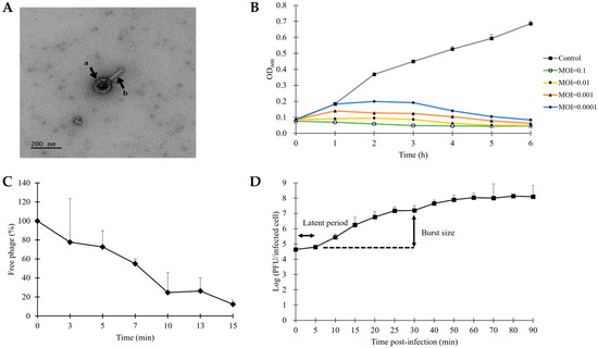 Biological characteristics of STEC phage vB_ESM-pEJ01. (A) Transmission electron micrograph of the phage is represented by the black arrows a and b with the icosahedral head and the contracted tail, respectively. The scale bar is 200 nm. (B) The bacteriolytic activity of the phage was assessed at four different MOIs (0.0001, 0.001, 0.01, and 0.1) on host strain ATCC 43895. The kinetics of adsorption rate (C) and one-step growth (D) of the phage. The adsorption rate was evaluated by calculating the percentage of free phages at an MOI of 0.01. The one-step growth curve depicted the latent time and burst size of the phage. Error bars represent the standard deviation of three replicates.