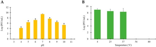 pH (A) and thermal (B) stability of STEC phage vB_ESM-pEJ01. The pH stability of the phage was determined at nine different pH values (pH 3–11) and the thermal stability of the phage was determined at five different temperatures (4–80 °C). Error bars represent the standard deviation of three replicates. Asterisks (*) indicate a statistically significant difference (p < 0.05).