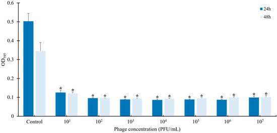 To evaluate the effect of phage vB_ESM-pEJ01 on biofilm formation by the host strain ATCC 43895, bacterial cells were incubated with different concentrations of the phage suspension (101, 102, 103, 104, 105, 106, and 107 PFU/mL) for 24 and 48 h (Figure 3). The results indicated that the phage effectively inhibited biofilm formation compared to the control group without phage treatment. Even at low phage concentrations, its anti-biofilm activity was consistently maintained across all tested phage titers, ranging from 101 to 107 PFU/mL, suggesting that the phage significantly reduced biofilm formation by STEC.