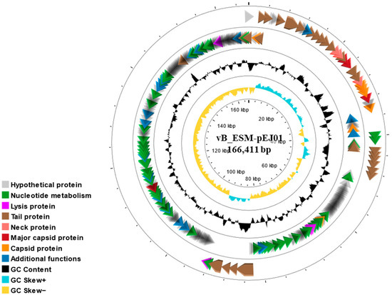 Circular genome map of STEC phage vB_ESM-pEJ01. The map is illustrated with the external and inner rings showing ten categories of genes encoding putative functional proteins and GC content with different colors using CGView.