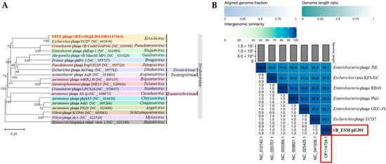 (A) VICOTR-based Genome BLAST Distance Phylogeny (GBDP) tree of STEC phage vB_ESM-pEJ01. A tree was constructed with the 19 other phages belonging to the Straboviridae family. (B) A VIRIDIC heat map showing the intergenomic similarity between the phage (red box) and six Krischvirus phages. The right side of the heatmap uses a gradient of blue hues to represent the similarity percentage among the genomes, with darker shades indicating higher similarity. The left side displays three genomic metrics: the aligned genome fraction for each genome in the rows (upper section), genome length ratios (middle section), and the aligned genome fraction for the genome in each column (lower section).