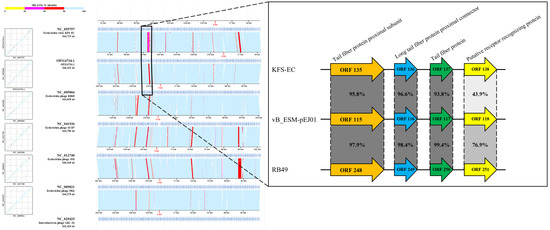 A VICTOR-based phylogenetic analysis using whole-genome sequences of the STEC phage vB_ESM-pEJ01 and 17 other related phages within the family Straboviridae revealed that the phage was phylogenetically more closely related to the genus Krischvirus (Figure 5A). In addition, based on the average nucleotide identity (ANI) values calculated using VIRIDIC, a heatmap was constructed with high intergenomic similarity (>90%) among STEC phages belonging to the genus Krischvirus available in the GenBank (Figure 5B). Additional phylogenetic trees were constructed using functional proteins, including major capsid protein (Supplementary Figure S1A) and terminase large subunit (Supplementary Figure S1B). These analyses demonstrated that phage vB_ESM-pEJ01 clustered into distinct branches separate from other Krischvirus phages, suggesting a unique taxonomic position within this genus. Genome alignment was performed using ViPTree to determine the most homologous regions in the genomes of the phage and six Krischvirus phages. Interestingly, a unique sequential cluster comprising four tail fiber proteins was identified (Figure 6), including tail fiber protein proximal subunit (ORF 115; amino acid identities, 95.7–99.2%), long tail fiber protein proximal connector (ORF 116; amino acid identities, 96.5–99.2%), tail fiber protein (ORF 117; amino acid identities, 93.7–99.6%), and large distal tail fiver subunit (ORF 118; amino acid identities, 43.8–78.1%), which is a characteristic feature of the T4-like coliphage subgroup RB49 genome (Supplementary Table S2).