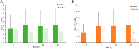 Efficacy of STEC phage vB_ESM-pEJ01 in STEC-contaminated green juice under the incubation at 4 (A) and 25 °C (B). The viable host cells were counted on STEC CHROMagar after phage treatment for 0, 6, 12, and 24 h compared to the control group without phage. The error bars represent the standard deviation of three replicates. Asterisks (*) indicate a statistically significant difference (p < 0.05).