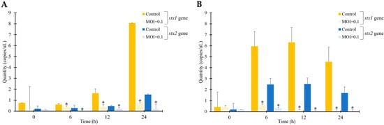 Absolute abundance of stx1 and stx2 genes of STEC phage vB_ESM-pEJ01 in STEC-contaminated green juice under the incubation at 4 (A) and 25 °C (B). Both the stx genes were quantified using a standard curve generated with qPCR, following phage treatment for 0, 6, 12, and 24 h compared to the control group without phage. The error bars represent the standard deviation of three replicates. Asterisks (*) indicate a statistically significant difference (p < 0.05).