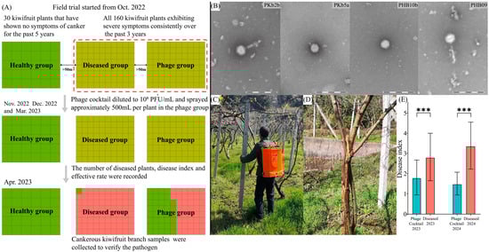 The morphology characteristics of four phages and the field trial. (A) The procedure of the field trial. Kiwifruit plants exhibiting canker symptoms are denoted by pink squares, while green squares represent asymptomatic plants. Green square: healthy plants. Khaki square: plants have a history of canker disease. Red square: diseased plants. (B) Transmission electron microscopy images of the phages PKb2b, PKb5a, PHB10b, and PHB09. Scale bars represent 200 nm. (C) Phage cocktail was sprayed in the field. (D) Cankers with exudates on P. syringae pv. actinidiae-infected kiwifruit branches. (E) Effects of phage cocktail on bacterial canker of kiwifruit disease index in field. Asterisks indicated significant differences between groups, as indicated by the t-test or Wilcoxon test (*** p < 0.001).