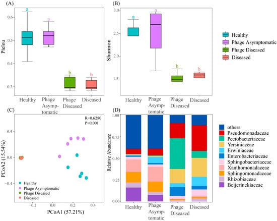The rare taxa (Figure 5C) exhibited a higher taxonomic diversity compared to the abundant taxa. Specifically, the rare taxa of all four groups comprised 15 families, including Acetobacteraceae, Beijerinckiaceae, Caulobacteraceae, Bacillaceae, Chitinophagaceae, and Alcaligenaceae, etc. Notably, Acetobacteraceae was consistently present in all four groups of rare taxa with substantial abundance levels, whereas AB−539−J10, Aeromonadaceae, and Azospirillaceae were exclusively found in the rare taxa of the healthy group. Bacillaceae, as a rare taxon, was present in all groups except the diseased group. Bacteriovoracaceae only existed in the rare taxa of the diseased group. Additionally, Abditibacteriaceae was found exclusively in the rare taxa composition of the phage diseased group. Notably, both healthy and phage asymptomatic groups contained Comamonadaceae as a unique rare taxon, while it was absent in other groups. Furthermore, Bacteroidaceae existed as a specific rare taxon for both the phage diseased and diseased groups.