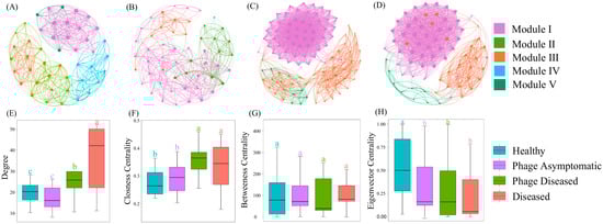 Co-occurrence network patterns of branch endophytic bacterial communities. The co-occurrence network showed the connectivity between the core branch endophytic ASVs of healthy (A), phage asymptomatic (B), diseased (C), and phage diseased (D) groups. Comparison between node-level topological features such as degree (E), closeness centrality (F), betweenness centrality (G), and eigenvector centrality (H) in each group. Means not sharing the same letter are significantly different by the t-test or Wilcoxon test (p < 0.05). The areas of different colors represent aggregation modules of branch endophytic bacterial communities; the lines between the nodes represent the correlation between the connected ASVs.
