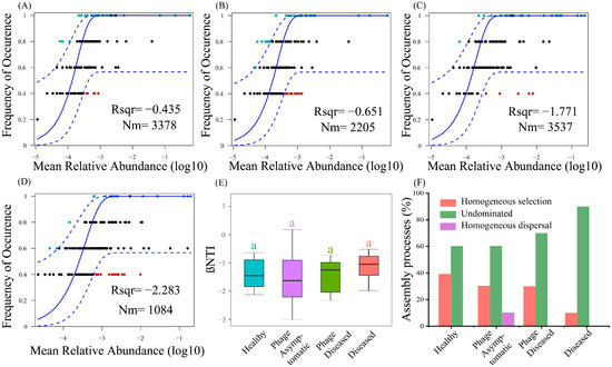 Compared to other treatments, the healthy group exhibited a higher eigenvector centrality, which can be attributed to its greater diversity and richness. This state of health also ensured that network features were maintained at elevated levels. In order to identify factors shaping community composition, it is crucial to investigate the relative significance of deterministic and stochastic processes in community assembly [27]. However, it was agreed that the neutral model alone should not be used to determine the relative significance of ecological processes on community assembly [50]. Therefore, in this study, the neutral model was integrated with the null model. Our findings indicate that the assembly processes of the four subgroups of communities deviate from the predictions of the neutral model, suggesting a stronger influence of deterministic processes on community assembly. By employing the null model theory, it was observed that stochastic processes predominantly governed community assembly in the diseased group compared to the healthy group. Furthermore, as disease severity increased, undominated processes (representing stochastic processes) steadily accounted for up to 90% of community assembly in the diseased group.