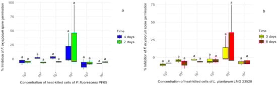 The box plots illustrating the percentage inhibition of F. oxysporum spore germination in liquid media following treatment with heat-killed cells (HKC) of (a) P. fluorescens PF05 and (b) L. plantarum LMG 23520, harvested and heat-killed after 24 h of incubation. Inhibition was measured at 4 and 7 days for P. fluorescens PF05 and at 3 and 6 days for L. plantarum LMG 23520. Statistical differences between HKC concentrations were determined separately for each time point using one-way ANOVA, followed by Tukey’s post hoc test (p < 0.05), with significant differences indicated by different letters.