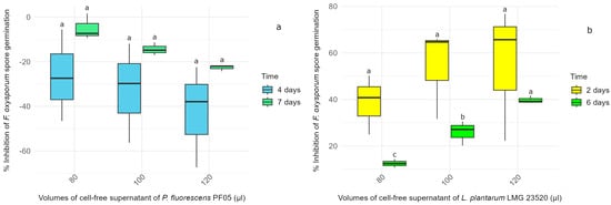 The box plots illustrating the percentage of inhibition of F. oxysporum spore germination in liquid media following treatment with varying volumes of cell-free supernatant (CFS) of (a) P. fluorescens PF05 and (b) L. plantarum LMG 23520, harvested after 24 h of incubation. Inhibition was measured at 4 and 7 days for P. fluorescens PF05 and at 2 and 6 days for L. plantarum LMG 23520. Statistical differences between CFS volumes were determined separately for each time point using one-way ANOVA, followed by Tukey’s post hoc test (p < 0.05), with significant differences indicated by different letters.