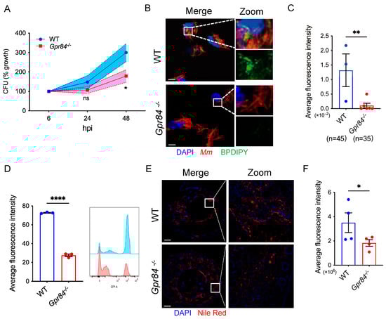BMDMs from Gpr84−/− and WT mice were infected with Mm-tdTomato at an MOI of 1, and intracellular bacterial proliferation was assessed at 6, 24, and 48 hpi. Gpr84−/− BMDMs demonstrated significantly lower bacterial loads in comparison to WT BMDMs (Figure 3A). Because LD accumulation can influence mycobacterial growth within macrophages [38], we hypothesized that GPR84 deficiency might also affect LD accumulation in macrophages. Using BODIPY staining to visualize LD accumulation in BMDMs, we found that following Mm-tdTomato infection induced the formation of LDs, which co-localized with Mm-tdTomato. Compared to WT BMDM, Gpr84−/− BMDMs exhibited less co-localization of bacteria with LDs (Figure 3B) and a reduced BODIPY fluorescence intensity, indicating fewer LDs (Figure 3C). Furthermore, flow cytometry analysis confirmed a significant reduction in the number of BODIPY+ macrophages within the Gpr84−/− group (Figure 3D). Similarly, the histological examination of sections from the tail lesions revealed significantly less LD accumulation in the lesions of Gpr84−/− mice (Figure 3E,F) compared to WT mice.