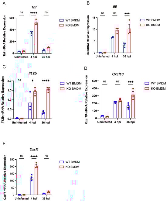 To further explore the factors contributing to the limited proliferation of mycobacterium in Gpr84−/− BMDMs, we conducted a systematic analysis of differentially expressed genes (DEGs) in Mm-infected WT and Gpr84−/− BMDMs using RNA-seq technology. WT and Gpr84−/− BMDM samples were effectively differentiated through multidimensional scaling (Figure 4A,B). Compared to WT BMDMs, 25 genes were significantly upregulated in Gpr84−/− BMDMs at both 4 hpi and 36 hpi. Among these, Adamts1 [39], Bex1 [40], Col5a3 [41], Mid1 [42], and Tie1 [43] have previously shown to be highly expressed during inflammatory responses and exhibit pro-inflammatory characteristics, which are closely associated with an enhanced host bactericidal function. Additionally, the genes Mgll [44], Dgat2 [45], Slc27a6 [45], and Stard10 [45] have been implicated in lipid metabolism, indicating that lipid metabolism may be disrupted in Gpr84−/− BMDMs during mycobacterial infection. Notably, among the 66 upregulated genes identified in Gpr84−/− BMDMs at 36 hpi, there were genes associated with the NF-kappaB signaling pathway, including Ccl4, Cxcl1, and Bcl2a1a [46,47,48]. Other genes related to the macrophage inflammatory response, such as Il6 and Il12b, also exhibited upregulation at 36 hpi but not 4 hpi. These findings suggest that Gpr84−/− BMDMs at 36 hpi may enhance the inflammatory response in macrophages, thereby facilitating the control of mycobacterium proliferation (Figure 2G and Figure 4D). Subsequently, we utilized the KEGG database to categorize the functions of DEGs and conducted a further analysis of the variations in downstream signaling pathways. Compared to 4 hpi, BMDMs at 36 hpi exhibited enhanced enrichment in genes related to pathways seen in diseases (such as Amoebiasis, alcoholic liver disease, and COVID-19), receptor signaling (such as RIG-I-like receptor signaling pathway and C-type lectin receptor signaling pathway), IL-17 signaling pathway, and the positive regulation of nitric oxide biosynthetic pathway (Figure 4E). Genes such as Il12b, Il6, Cxcl10, Tnf, and Cxcl1 are involved in multiple pathways, suggesting that the genes upregulated in Gpr84−/− BMDMs at 36 hpi may help to control mycobacterium proliferation. Furthermore, the gene expression analysis of cytokines associated with bactericidal activity found that the mRNA expression of pro-inflammatory cytokines Tnf, Il6, Il12b, Cxcl10, and Cxcl1 were significantly upregulated compared to WT BMDMs at 4 hpi (Figure 5A–E).