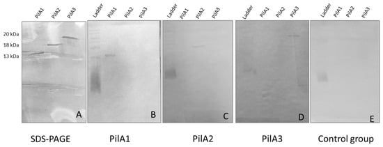 SDS-PAGE of recombinant pilus proteins and Western blot analyses: (A) Purified PilA1 (lane 1), PilA2 (lane 2) and PilA3 (lane 3) were visualized by SDS-PAGE and Coomassie staining. The molecular weights are indicated on the left. (B–E) The specificity of antibodies raised in chickens was determined by Western blot analyses. Sera from the group immunized with PilA1 (B), PilA2 (C), PilA3 (D) and from the control group (E) were tested against PilA1, PilA2 and PilA3.