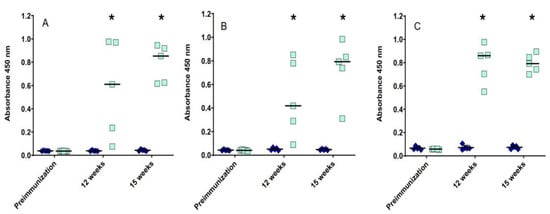 To test the immunogenicity of the three purified pilins, four groups of birds were immunized twice with PilA1, PilA2 or PilA3 recombinant proteins. The fourth group was immunized with adjuvant alone. Serum IgY titers against pilin proteins were determined in all five birds from each group before and after both immunizations (12 weeks and 15 weeks). Significantly higher serum antibody responses were observed at 12 (mean OD450 values between 0.485 and 0.791) and 15 weeks (mean OD450 values between 0.731 and 0.795) in all of the immunized groups compared to the pre-immune controls, with mean OD450 values between 0.043 and 0.073 (Figure 2). To verify that the antibody response was specific to the pilin proteins, a Western blot analysis was performed. The antibodies raised against PilA1, PilA2 and PilA3 were specific to their immunizing antigen (Figure 1B–E). As for the mucosal antibody response, no significant increase in the IgA titers was observed for each pilin protein tested.