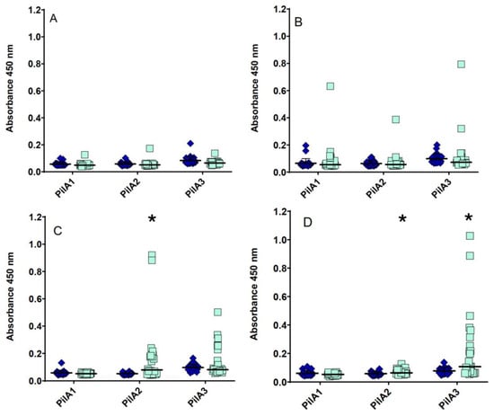 Comparison between pre-immunization and final sera IgY response against pilin proteins following the experimental C. perfringens infection. Comparison between pre-immunization and final sera IgY response against PilA1, PilA2 and PilA3 from the control (A), PilA1-immunized (B), PilA2-immunized (C) and PilA3-immunized (D) groups. Each symbol represents a single bird and horizontal lines represent means. Statistical differences between pre-immune (blue diamonds) and final (teal squares) absorbance values were determined by a t-test for dependent samples. * p < 0.05.