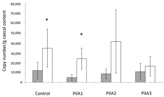 Quantification of C. perfringens in ceca before and after infection. Quantification of C. perfringens in ceca before and after experimental infection for each group as determined by real-time PCR. Statistical differences between the bacterial counts before (gray bars) and after (white bars) infection were determined by an unequal variance t-test. * p < 0.05.