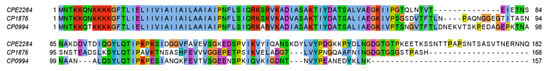 Alignment of the PilA2 protein sequences from strains CP0994 and CP1876 to the reference PilA2 protein (CPE2284). Sequences were aligned using MUSCLE v3.8 and visualized using Jalview v.2.11.2.5. Names of strains and the reference are shown on the left side of the sequences whereas 297 amino acids positions are shown above. Conserved regions are highlighted in colors. Gaps in a 298 sequence are indicated by the symbol dash (-).