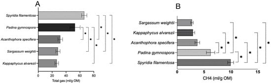 Total gas and CH4 production from five seaweeds per gram of organic matter. (A) total gas production and (B) CH4 production. mL/g OM—milliliter per gram of organic matter; CH4—methane. Each horizontal bar in the individual panels (A,B) of the figure represents a treatment (seaweed), and the comparison was performed between the bars within each panel. The mean value represented by an individual bar is based on six replicates (n = 6). The p value was calculated using one-way analysis of variance in GraphPad Prism version 10.2.3, and the significance between the mean values represented by bars in panels (A,B) was ascertained employing Tukey post-hoc analysis at a 0.05 alpha threshold and a 95 percent confidence level. * Denotes significance between two seaweeds at 5%.