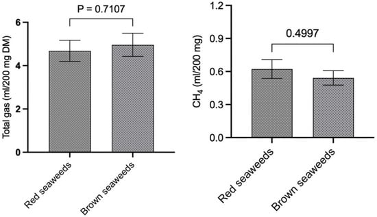 The CH4 volume (mL) was calculated using the total gas volume produced during 24 h of in vitro incubation and the % CH4 in total gas. The CH4 concentration was expressed as mL/200 mg of dry matter (DM) and mL/g of OM in seaweed. The comparative efficacy of red vs. brown seaweeds was ascertained by categorizing the CH4 production (mL/200 mg) data into two categories and performing a statistical analysis.