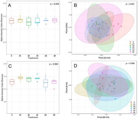 (A–D): Alpha and beta diversity are represented by the Shannon index and Bray–Curtis, respectively. Panels (A,B) in the figure represent the alpha and beta diversity of the metagenome in Kappaphycus alvarezi—KAi—respectively, whereas panels (C,D) depict the alpha and beta diversity of the metagenome in Sargassum wightii—SW. C, A1, A2, A3, A4, and A5 are treatments that represent the effect of various inclusion levels of SW or KA on microbial diversity at 0, 1, 2, 3, 4, and 5 percent of the straw- and concentrate-based diet, respectively.