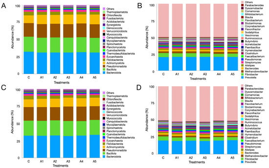 Rumen metagenome composition as affected by the graded supplementation of Kappaphycus alvarezii—KA—at the phylum (panel (A)) and genus (panel (B)) levels. Panels (C,D) depict the effect of graded levels of Sargassum wightii—SW—on metagenome composition at the phylum and genus levels, respectively. C, A1, A1, A3, A4, and A5 are treatments representing the effect of various inclusion levels of KA/SW on microbial diversity at 0, 1, 2, 3, 4, and 5 percent levels in the straw- and concentrate-based diet, respectively.