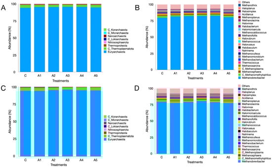 Archaeal metagenome composition as affected by the graded supplementation of Kappaphycus alvarezii—KA—at the phylum (panel (A)) and genus (panel (B)) levels. Panels (C,D) depict the effect of graded levels of Sargassum wightii—SW—on archaeal metagenome composition at the phylum and genus levels, respectively. C, A1, A2, A3, A4, and A5 are treatments that represent the effect of various inclusion levels of KA/SW on archaeal diversity at 0, 1, 2, 3, 4, and 5 percent levels in straw- and concentrate-based diets, respectively.