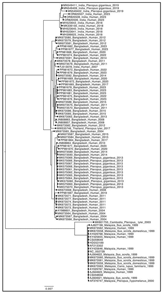 - de Campos, G.M.; Cella, E.; Kashima, S.; Alcântara, L.C.J.; Sampaio, S.C.; Elias, M.C.; Giovanetti, M.; Slavov, S.N. Updated Insights into the Phylogenetics, Phylodynamics, and Genetic Diversity of Nipah Virus (NiV). Viruses 2024, 16, 171. [Google Scholar] [CrossRef] [PubMed]