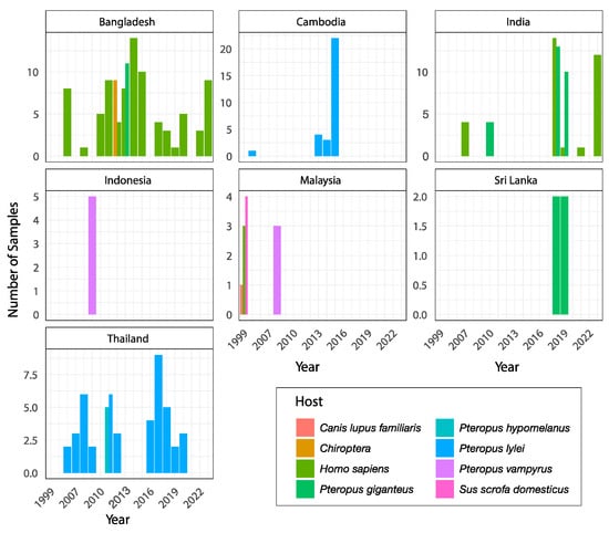 - Wacharapluesadee, S.; Boongird, K.; Wanghongsa, S.; Ratanasetyuth, N.; Supavonwong, P.; Saengsen, D.; Gongal, G.; Hemachudha, T. A longitudinal study of the prevalence of Nipah virus in Pteropus lylei bats in Thailand: Evidence for seasonal preference in disease transmission. Vector-Borne Zoonotic Dis. 2010, 10, 183–190. [Google Scholar] [CrossRef]