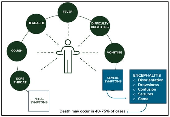 - Hossain, M.J.; Gurley, E.S.; Montgomery, J.M.; Bell, M.; Carroll, D.S.; Hsu, V.P.; Formenty, P.; Croisier, A.; Bertherat, E.; Faiz, M.; et al. Clinical presentation of nipah virus infection in Bangladesh. Clin. Infect. Dis. 2008, 46, 977–984. [Google Scholar] [CrossRef] [PubMed]