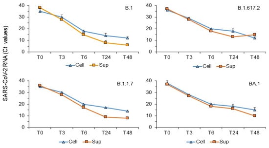 SARS-CoV-2 qPCR genomic RNA amplification performed on samples from Vero E6 cells infected with different viral variants. Cells were infected with SARS-CoV-2 variants (SCV2/Fi/3/22 (Wuhan-like B.1), SCV2/Fi/1/21 (Alpha B.1.1.7), SCV2/Fi/2/21 (Delta B.1.617.2), and SCV2/Fi/1/22 (Omicron BA.1)) at an MOI of 0.1. Samples were collected at T0, T3, T6, T24, and T48 h post-infection for RNA extraction. One hundred nanograms of total RNA were amplified using primers and probes targeting the SARS-CoV-2 N region. Mean + standard deviation values of the CT cycles were obtained from three independent experiments.