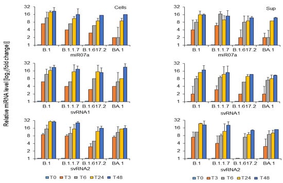 Relative expression of SARS-CoV-2 miRNA-like small RNA in Vero E6 cells measured at various times post-infection. Vero E6 cells were infected with SARS-CoV-2 variants (Wuhan-like B.1, Alpha-like B.1.1.7, Delta-like B.1.617.2, Omicron-like BA.1) at an MOI of 0.1. Samples from cells and supernatant (Sup) were collected at T0, T3, T6, T24, and T48 h after infection for RNA extraction. Using 100 ng of total RNA, RT-qPCR with specific primers was performed. Relative fold change was quantified via the ΔΔCt method with U6 snRNA as a control. Results are presented as mean + standard deviation from 3 independent experiments.