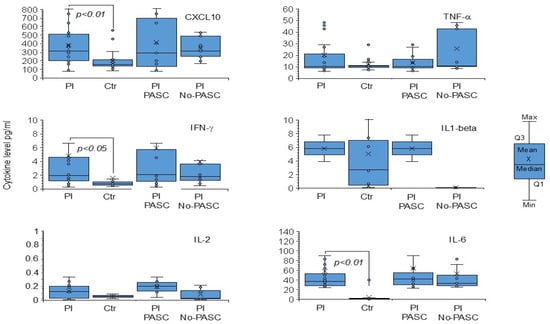 Cytokine levels in plasma samples collected at the initial SARS-CoV-2 positive diagnosis in study patients. Pl, all plasma samples, Pl PASC, plasma samples from patients with PASC, Pl No-PASC, plasma samples from patients without PASC. Ctr, plasma controls. Interferon-gamma Inducible Protein 10 (CXCL-10/IP-10), Interferon-gamma (IFN-γ), Interleukin-1β (IL-1 β), Interleukin-2 (IL-2) Interleukin-6 (IL-6), and Tumor Necrosis Factor-alpha (TNF-α). The box and whisker plots display the complete data set, indicating the minimum (min) and maximum (max) values, the first quartile (Q1), the third quartile (Q3), the median, and the mean for all the cytokines examined. Values reported are mean obtained in 3 independent experiments. Differences from control (n.17) values were found to be statistically significant at p < 0.01 Students t-test.