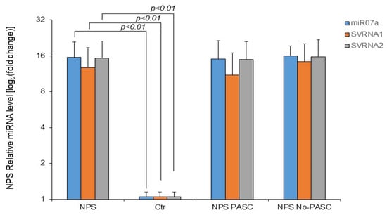 The relative expression of SARS-CoV-2 miRNA-like small RNA in NPS samples at various times following a positive diagnosis of SARS-CoV-2 analyzed in study patients. Total RNA (100 nanograms) underwent amplification using stem-loop small RNA-specific RT-qPCR. The ΔΔCt method determined the relative fold change quantification, utilizing U6 snRNA as an internal control. NPS, all nasopharyngeal swab samples, NPS PASC, nasopharyngeal swab samples from patients with PASC, NPS No-PASC, nasopharyngeal swab samples from patients without PASC, Ctr, NPS controls. The reported values are the mean + standard deviation from three independent experiments. Statistically significant differences from control values (n = 20) were identified at p < 0.01 (Student’s t-test).