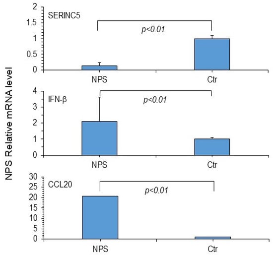 Expression levels of SERINC5, IFN-β, and CCL20 mRNAs in NPS samples from study patients. For relative quantification of these markers, the ΔΔCt method was applied, using RPP30 mRNA as an endogenous control [15]. Ctr, NPS controls. Serine incorporator protein 5 (SERINC5), interferon beta (IFN-β), and chemokine ligand 20 (CCL20). The results are presented as mean + standard deviation from at least three experiments. Differences from control values (n = 20) were statistically significant at p < 0.01 (Student’s t-test).