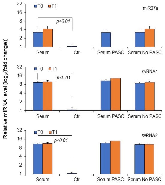 The relative expression of SARS-CoV-2 microRNA-like small RNA in serum samples assessed in study patients. A total of 100 nanograms of RNA was amplified using steam-loop small RNA-specific RT-qPCR. The ΔΔCt method quantified the relative fold change, employing U6 snRNA as an internal control [15]. Serum, all serum samples, Serum PASC, serum samples from patients with PASC, Serum No-PASC, serum samples from patients without PASC. Ctr, serum controls. T0, time at the first SARS-CoV-2 positive diagnosis. T1, time from diagnosis (92–193 days). Reported values represent the mean + standard deviation from three independent experiments. Differences from control values (n = 20) were statistically significant with a p-value of less than 0.01, as determined by Student’s t-test.