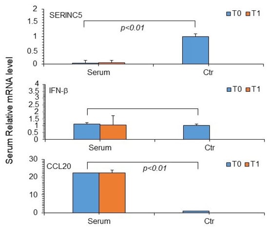 Expression levels of SERINC5, IFN-β, and CCL20 mRNAs in the serum samples of the study patients. For relative quantification of these markers, the ΔΔCt method was applied, using RPP30 mRNA as an endogenous control [15]. Ctr, serum controls. Serine incorporator protein 5 (SERINC5), interferon beta (IFN-β), and chemokine ligand 20 (CCL20). T0, time at the first SARS-CoV-2 positive diagnosis. T1, time from diagnosis (92–193 days). Reported values represent the mean + standard deviation from a minimum of three independent experiments. Statistical analysis revealed significant differences from the control group (n = 20) at p < 0.01 using Student’s t-test.