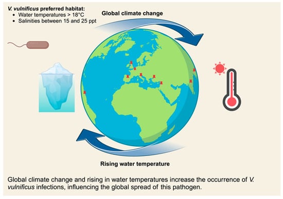 V. vulnificus is typically found in coastal or estuarine regions worldwide, where water temperatures range from 9 to 31 °C. However, its preferred habitat is more specific, with optimal conditions occurring at water temperatures above 18 °C and salinities between 15 and 25 parts per thousand (ppt) [7]. Notably, salinities of 30 ppt or higher significantly reduce the prevalence of V. vulnificus regardless of temperature [8]. As a result, most infections are linked to tropical or subtropical regions. Global climate change, which causes rising water temperatures, may increase the occurrence of V. vulnificus infections and influence the global spread of this pathogen (Figure 2) [9]. Despite the increase in cases, the infection rate remains relatively low, which contrasts with the widespread presence of V. vulnificus in marine environments. One possible explanation for this disparity is that V. vulnificus typically does not cause severe disease in otherwise healthy individuals [10]. However, individuals with pre-existing conditions such as chronic liver disease, diabetes, hemochromatosis, AIDS, cancer, or weakened immune systems are at a significantly higher risk of infection [2,11]. V. vulnificus has been classified into biotypes based on their biochemical characteristics, with three biotypes known to cause severe human diseases [12].