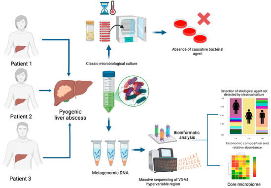 Finally, amplicons were purified using AMPure XP beads (Beckman Coulter, Brea, CA, USA), pooled in equimolar concentrations, and sequenced on a MiSeq Illumina instrument. The workflow of the investigation of the aetiology of PLAs (microbiological culture and massive sequencing by Illumina platform) is shown in Figure 2.