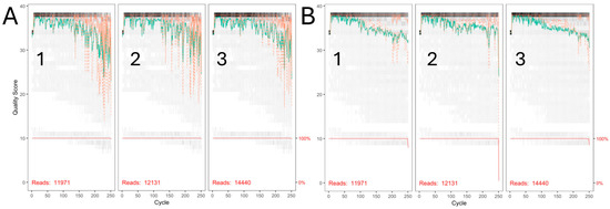 Analysis of sequence quality by base (Forward and Reverse) of the data obtained by massive sequencing of the 16s rRNA gene of the PLAs of the patients treated at Hospital Juárez de México. (A1,B1): PLA S178 reads, (A2,B2): PLA S179, and (A3,B3): PLA S180. Green: High-quality sequencing reads; red: low-quality sequencing reads.