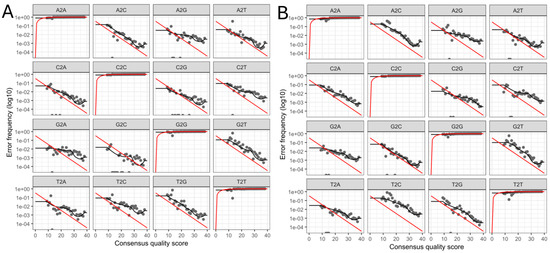 Analysis of the error rates for each possible nucleotide transition of the data obtained by massive sequencing of the 16s rRNA gene from the PLA of patients treated at Hospital Juárez de México. (A). Forward sequence and (B). Reverse sequence. Red line: Expected error rates under the nominal Q-score definition.