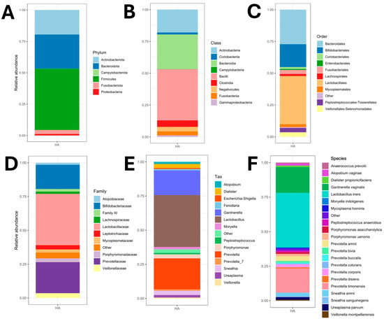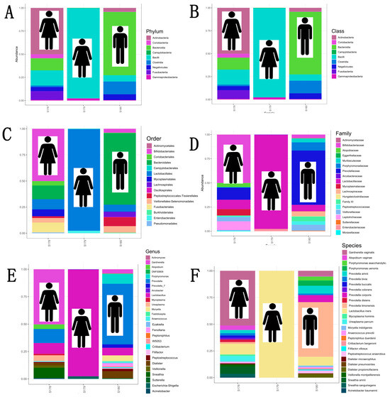 Individual taxonomic composition (by sex) of PLAs at six taxonomic levels and relative abundance. (A) Phylum. (B) Class. (C) Order. (D) Family. (E) Genus. (F) Species level.