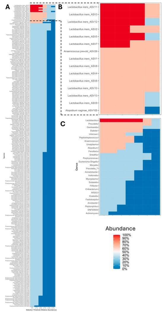 Core microbiome analysis of the PLA set showed 247 ASVs (Figure 7A), with a predominance of 10 ASVs, represented by bacteria with the highest relative abundances of the genera Lactobacillus, Prevotella, Gardnerella, Dialister, unknown group, Peptostreptococcus, Ureaplasma, Atopobium, and Fenollaria. Of the genera described above, species represented by L. iners, Anaerococcus prevotii, and Atopobium vaginae were prevalent up to 75% in relative abundance for L. iners (Figure 7B,C).